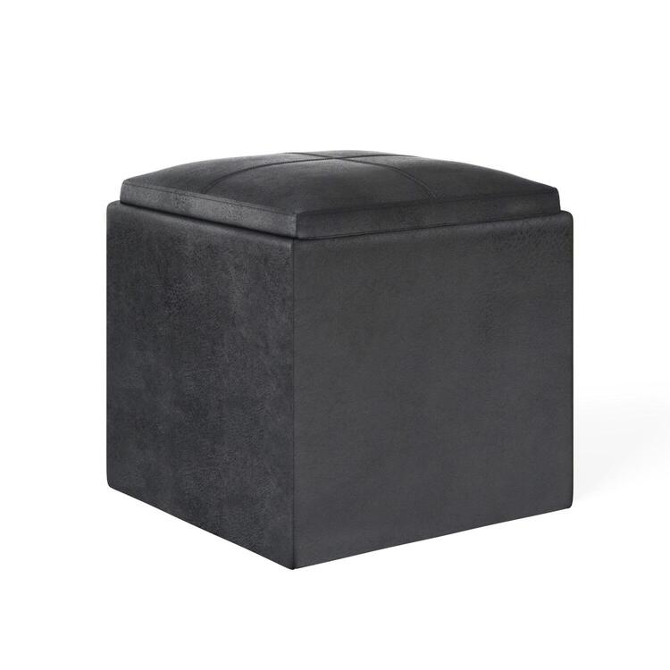 • Square Storage Ottoman with Tray - Distressed Black Vegan Leather - 17 Inch image - 1