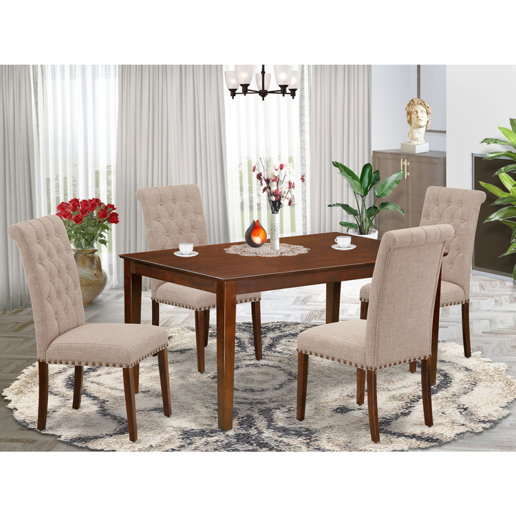 • 5-Piece Dining Set - Rectangle Table & 4 Parsons Chairs - Light Fawn Fabric, Mahogany Finish image - 1