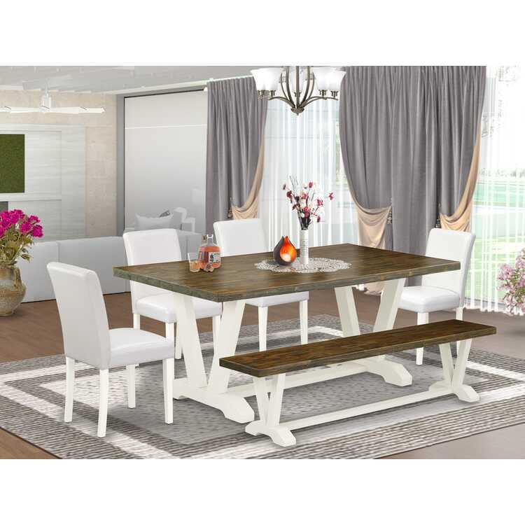 • HomeStock Beachy Beauty 6 Piece Dining Table Set Contains a Rectangle Dining Room Table with V Legs and 4 White Faux Leather Upholstered Chairs with a Bench, 40x72 Inch image - 1