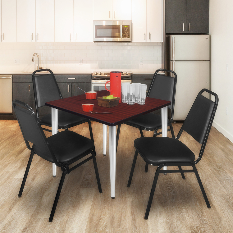 • HomeStock City Sleek 48" Square Breakroom Table Mahogany Top Chrome Base with 4 Black Restaurant Stack Chairs Scratch Resistant Vinyl Seat Back image - 1