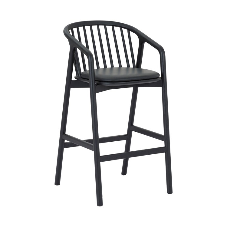 • HomeStock Cool Counter Stool Chair Curved Spindle Back Black Faux Leather Upholstery Oak Wood Stylish Comfort 21" x 21" x 38" image - 1
