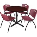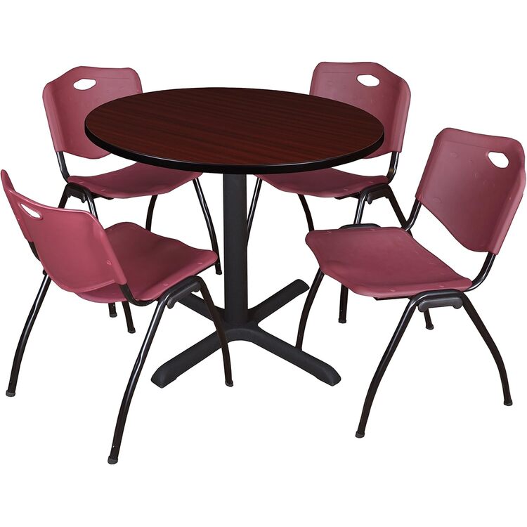 • HomeStock Lakefront Luxury 36" Round Breakroom Table- Mahogany & 4 'M' Stack Chairs- Burgundy, Ideal for Cafeterias, Dining, and Office Spaces image - 1