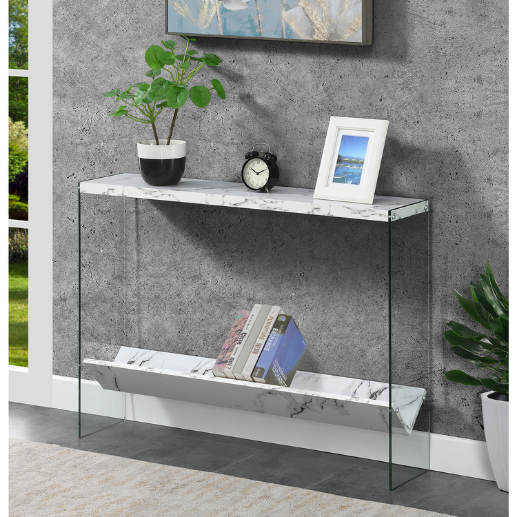 • HomeStock Lakeside Living V Console Table, 42-In x 9.25-In x 30-In , White Faux Marble Finish, Slanted Bottom Shelf, Sturdy Tempered Glass, Space-Saving Hallway Table image - 1
