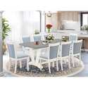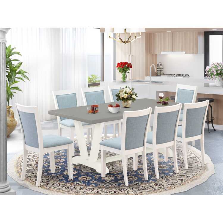 • HomeStock Rococo Romance 9 Piece Modern Dining Table Set Includes a Rectangle Wooden Table with V Legs and 8 Blue Linen Fabric Parsons Dining Chairs, 40x72 Inch image - 1