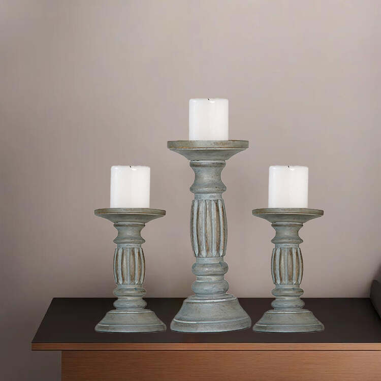 • HomeStock Traditional Antique Dusk Handmade Mango Wood Set Of Three 6",9" & 6" Pillar Candle Holder image - 1