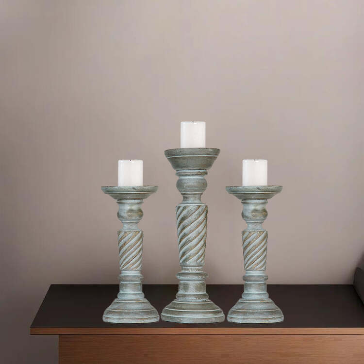 • HomeStock Traditional Antique Dusk Handmade Mango Wood Set Of Three 9",12" & 9" Pillar Candle Holder image - 1