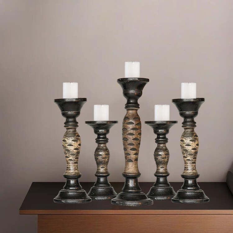 • HomeStock Traditional Dark Polish Handmade Mango Wood Set Of Five 9",12",15",12" & 9" Pillar Candle Holder image - 1