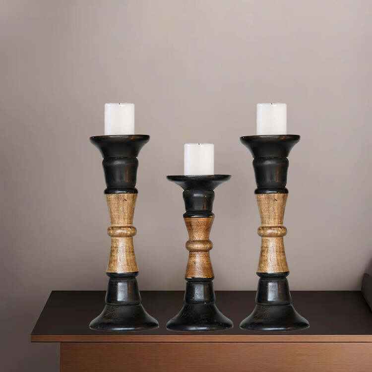 • HomeStock Traditional Dark Polish Handmade Mango Wood Set Of Three 12",9" & 12" Pillar Candle Holder image - 1