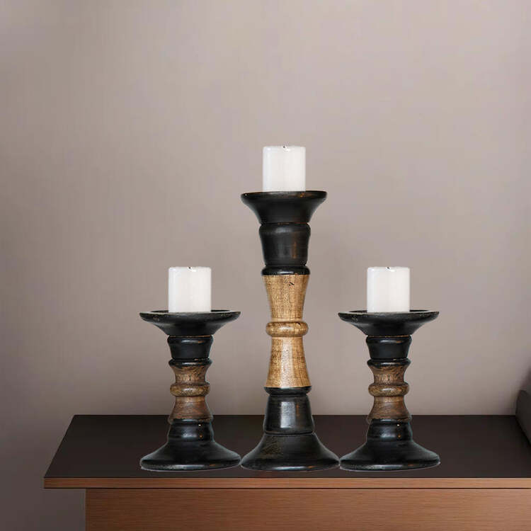 • HomeStock Traditional Dark Polish Handmade Mango Wood Set Of Three 6",12" & 6" Pillar Candle Holder image - 1