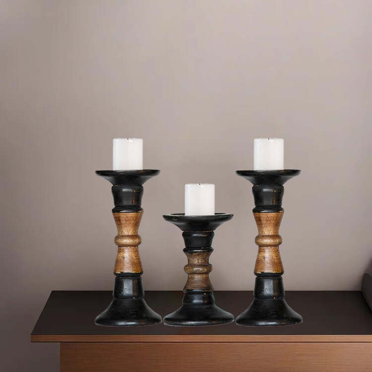 • HomeStock Traditional Dark Polish Handmade Mango Wood Set Of Three 9",6" & 9" Pillar Candle Holder image - 1
