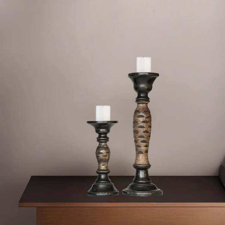 • HomeStock Traditional Dark Polish Handmade Mango Wood Set Of Two 9" & 15" Pillar Candle Holder image - 1