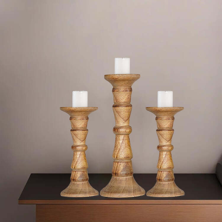 • HomeStock Traditional Wallnut Handmade Mango Wood Set Of Three 9",12" & 9" Pillar Candle Holder image - 1