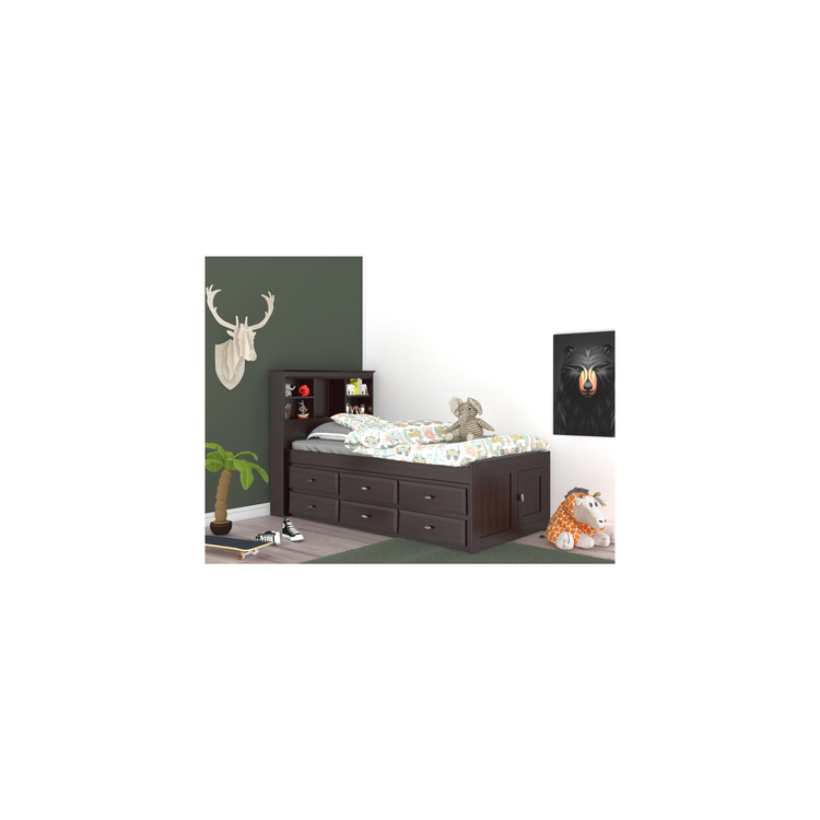 • Twin Bookcase Bed with Drawers - Dark Espresso Solid Wood Bed Frame & USB Port - Ready to Assemble image - 1