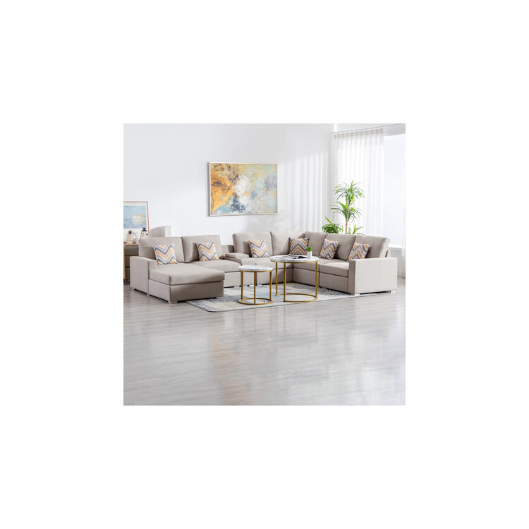 • Homestock Urban Oasis Linen Fabric 7Pc Reversible Chaise Sectional Sofa with a USB, Charging Ports, Cupholders, Storage Console Table and Pillows and Interchangeable Legs image - 1