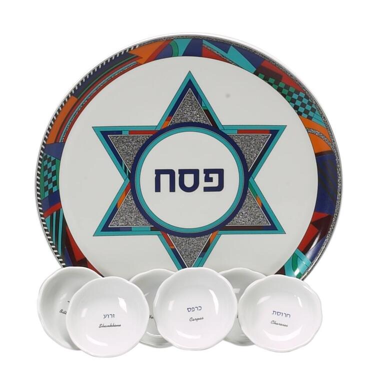 • Israel Giftware Elegant Porcelain Seder Plate with Dishes,Blue image - 1