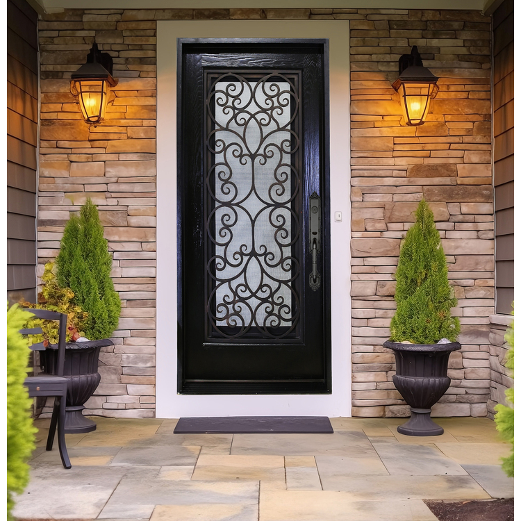 Composite Exterior Entry Doors Wrought Iron Tempered Glass Design