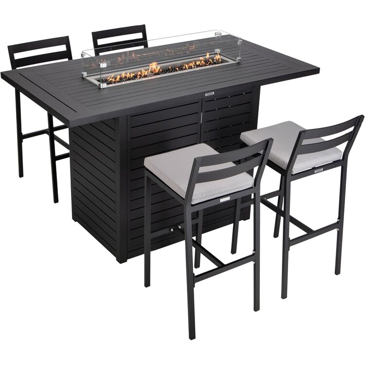 • LeisureMod Chelsea Collection Aluminum Outdoor Dining Set, 1 Bar Height Fire Pit Table and 4 Bar Chair in black with Light Grey Cushions image - 1