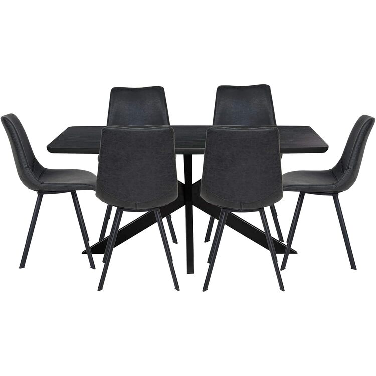 • LeisureMod Ravenna 7-Piece Dining Set with Rectangular Dining Table in X-Shaped Base and 6 Leather Dining Chairs in Charcoal Black image - 1