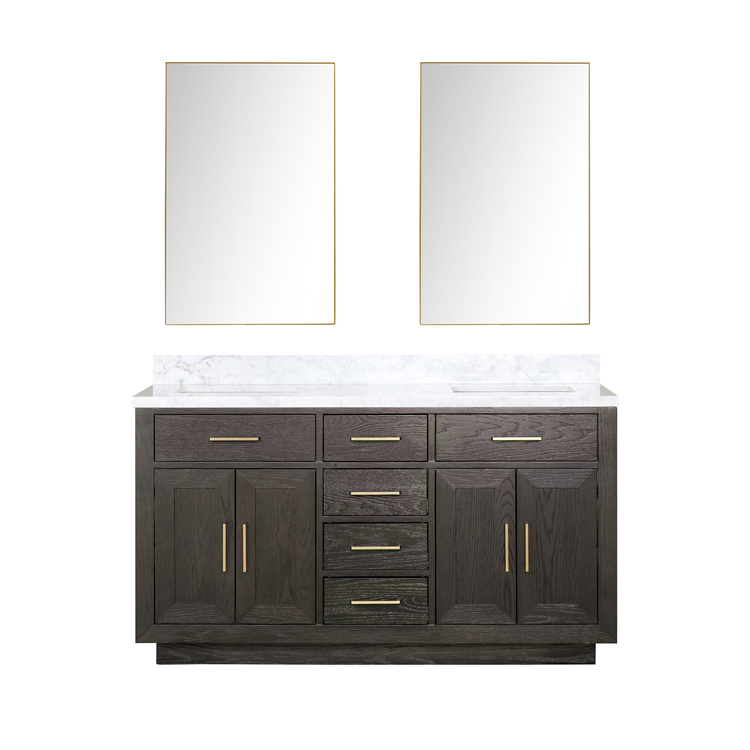 • Lexora Abbey 60 in W x 22 in D Brown Oak Double Bath Vanity, Carrara Marble Top, and 28 in Mirrors image - 1