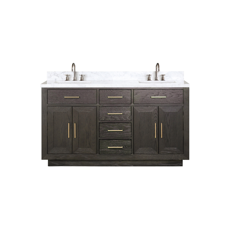• Lexora Abbey 60 in W x 22 in D Brown Oak Double Bath Vanity, Carrara Marble Top, and Faucet Set image - 1