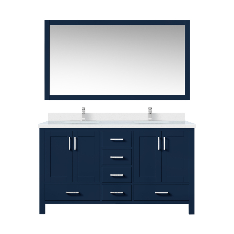 • Lexora Jacques 60 in. W x 22 in. D Navy Blue Double Bath Vanity, Cultured Marble Top, Faucet Set, and 58 in. Mirror image - 1