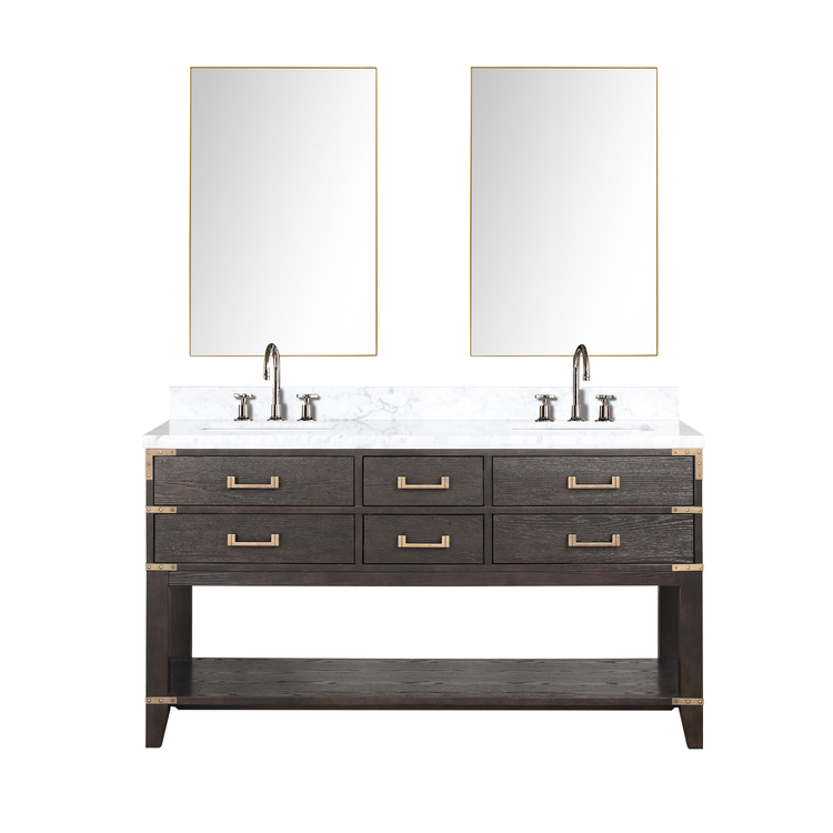 • Lexora Norwalk 60 in W x 22 in D Brown Oak Double Bath Vanity, Carrara Marble Top, Faucet Set, and 28 in Mirrors image - 1