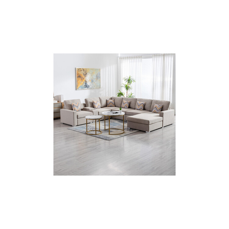 • Beige Reversible Chaise Sectional Sofa Set 7Pc Modern Linen Fabric image - 1
