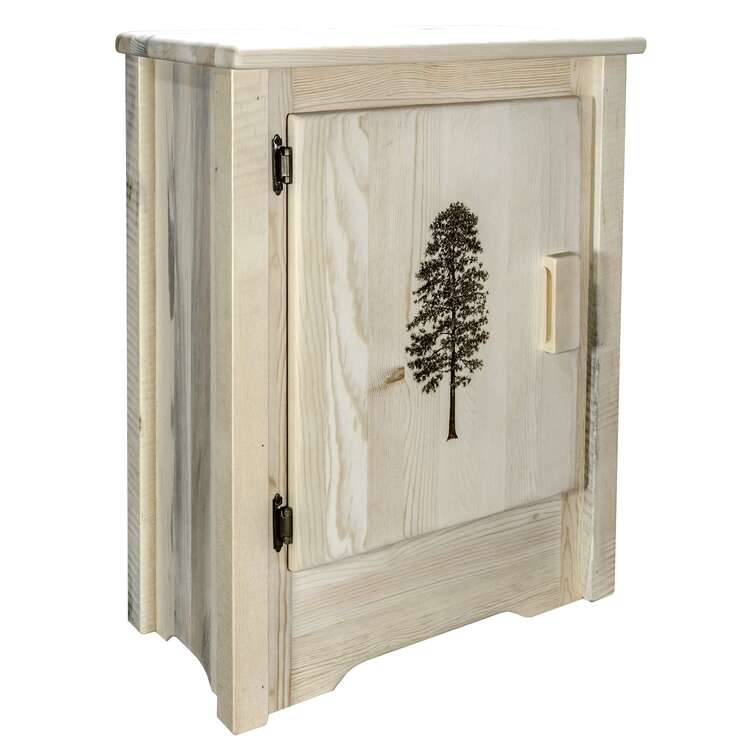 • Homestead Collection Accent Cabinet w/ Laser Engraved Pine Design, Left Hinged, Clear Lacquer Finish image - 1