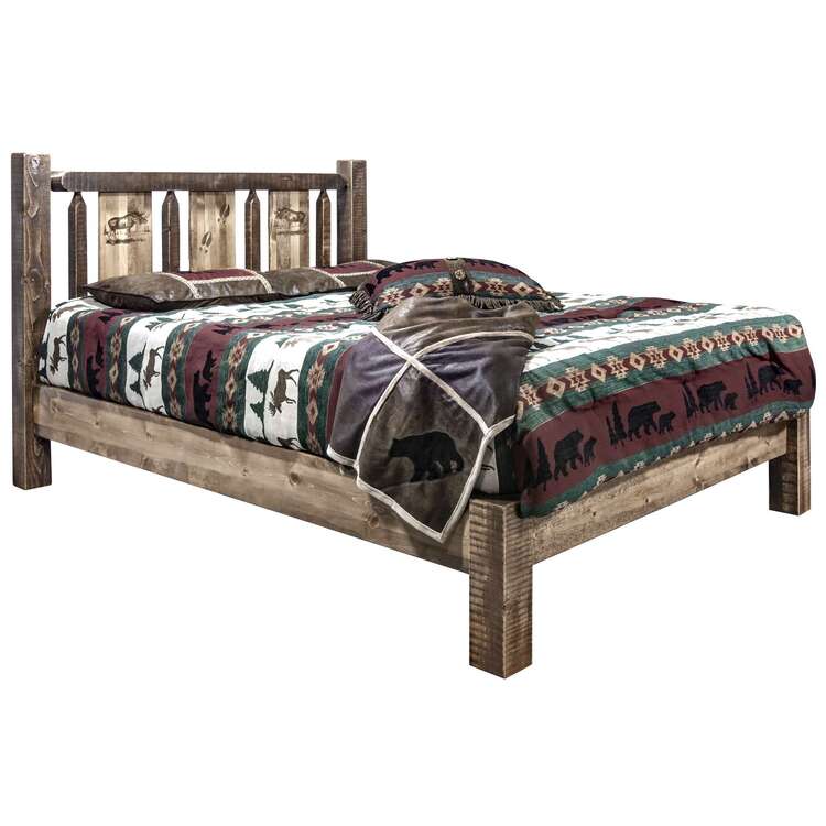 Homestead Collection Queen Platform Bed w/ Laser Engraved Moose Design, Stain & Clear Lacquer Finish