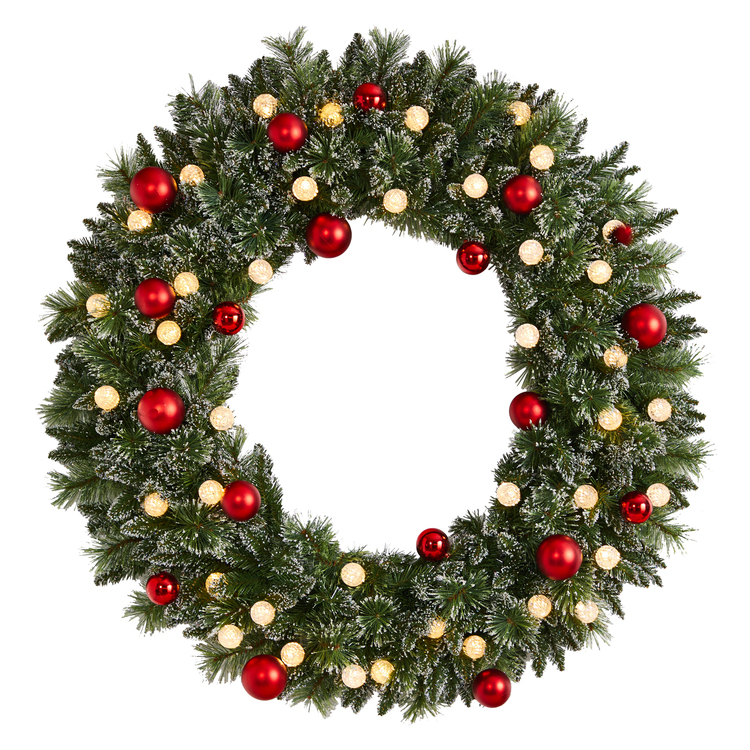 Nearly Natural 4ft. Oversized Pre-Lit Frosted Holiday Christmas Wreath with Ornaments and 40 LED Globe Lights