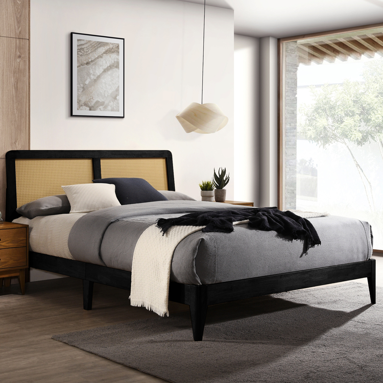 • Omax Decor Queen Platform Bed with Rattan Headboard - Black Wood Frame image - 1