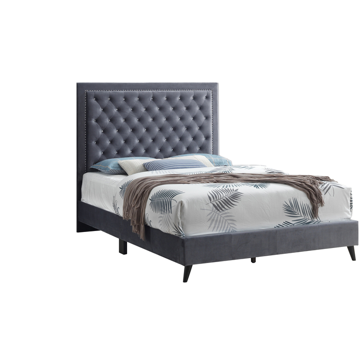 • Passion Furniture Alba Gray Velvet Queen Bed with Crystal Tufting image - 1