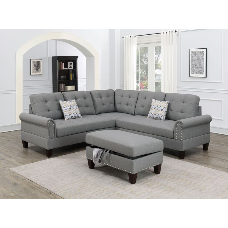 Poundex 3 Piece Fabric Sectional Sofa Set with Storage Ottoman in Gray