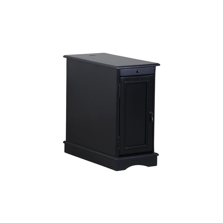 You?ll get a charge out of this lovely white end table with its flip open rear compartment housing usb and electrical changing. Sturdy and sized to fit just about anywhere at 12? wide, it?s deep enough at 24? to provide ample top space to hold anything from a lamp to gaming controls to a book, and a pull out tray with coasters creates more space for drinks or a snack plate. Closed storage behind a cabinet door is split by a single shelf. Also check out the bonus storage space in the back.