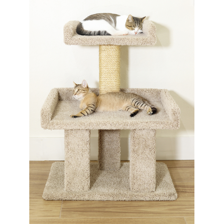 The Prestige Cat Trees XL Cat Perch is a solid built carpeted cat perch that features spacious perches for Large cats or multiple cat households. This piece is truly a one of a kind, with the lower perch measuring a large 25" wide and 18" deep end to end, this is sure to accommodate your bigger cats comfortably. Also featuring multiple carpeted posts for stability and scratching as well as a thick natural roped post that is much thicker than most of what you will find out there on the market. Also coming in at a height that makes this purrfect for gazing out the windows as well as a staggered design that makes climbing from the lower level to upper level very easy for those cats that don't move around as easy as they would like.