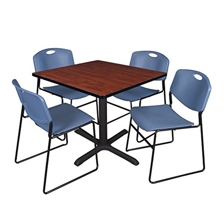 • Cain 42" Square Breakroom Table- Cherry & 4 Zeng Stack Chairs- Blue image - 1