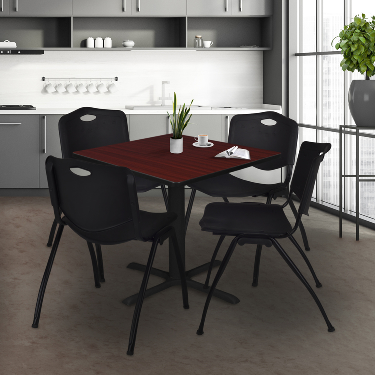 • Square Mahogany Breakroom Table 48 with Black Stack Chairs 4 - Piece Set - Regency Seating image - 1