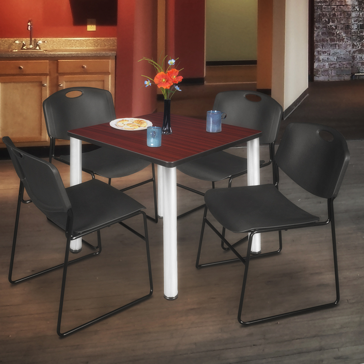 • Square Breakroom Table Mahogany/Chrome with Black Stack Chairs - Regency Seating image - 1