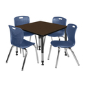 Regency Kee 36 in. Square Adjustable Classroom Table- Neo Walnut Top, Black Base & 4 Andy 18 in. Blue Stack Chairs