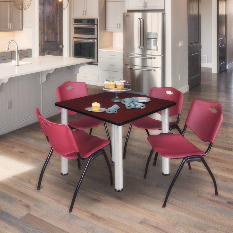 • Regency Kee 42" Square Breakroom Table- Mahogany/ Chrome & 4 'M' Stack Chairs- Burgundy image - 1