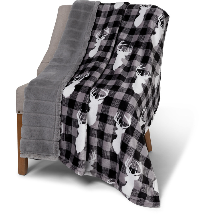 • Throw Faux Fur Reversible Black Plaid Deer image - 1