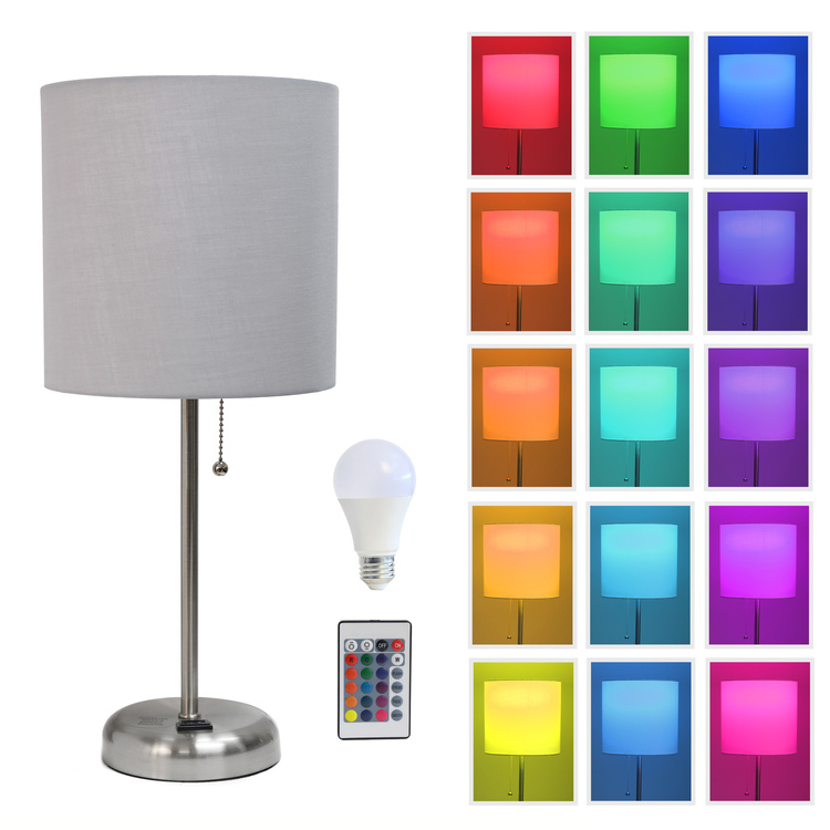 • Simple Designs 19.5" Brushed Steel Stick Lamp With Charging Outlet And Gray Fabric Shade, Bedroom, Dorm, Kids Romm, Color Changing Led Bulb Included image - 1