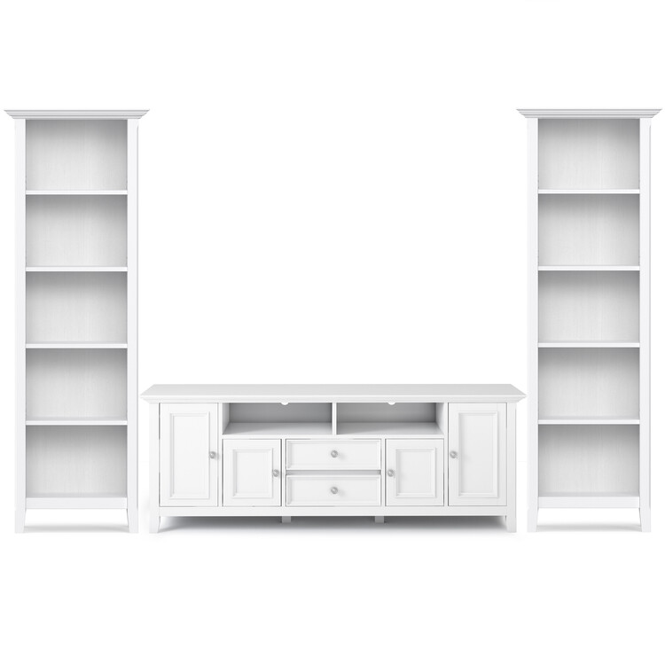 • Simpli Home Amherst Solid Wood Transitional 72 inch Wide TV Stand with Two 24 inch Wide 5 Shelf Bookcases in White (Set of 3) image - 1