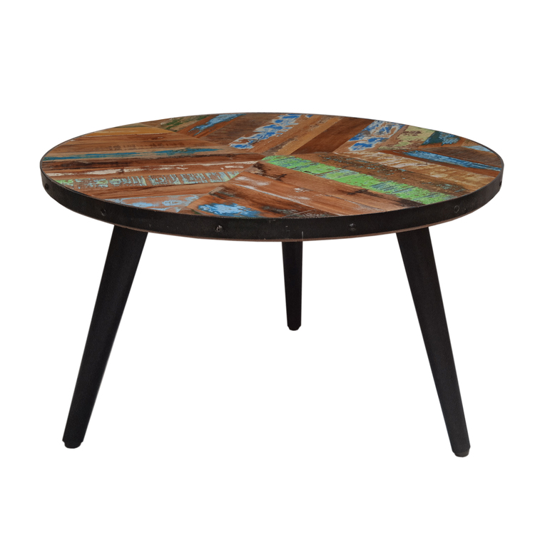 The Urban Port 17 Inch Industrial Side Table, Reclaimed Wood, Round Multi Tone Top, Iron Trim, Brown, Black