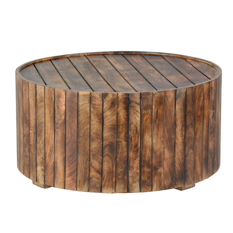• The Urban Port 34 Inch Handmade Wooden Round Coffee Table with Plank Design, Burned Brown image - 1