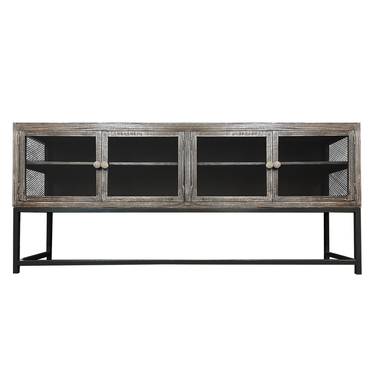 • The Urban Port 71 Inch Rustic Media Console TV Stand, 4 Glass Panel Doors, Solid Wood, Metal Frame, Brown and Black image - 1