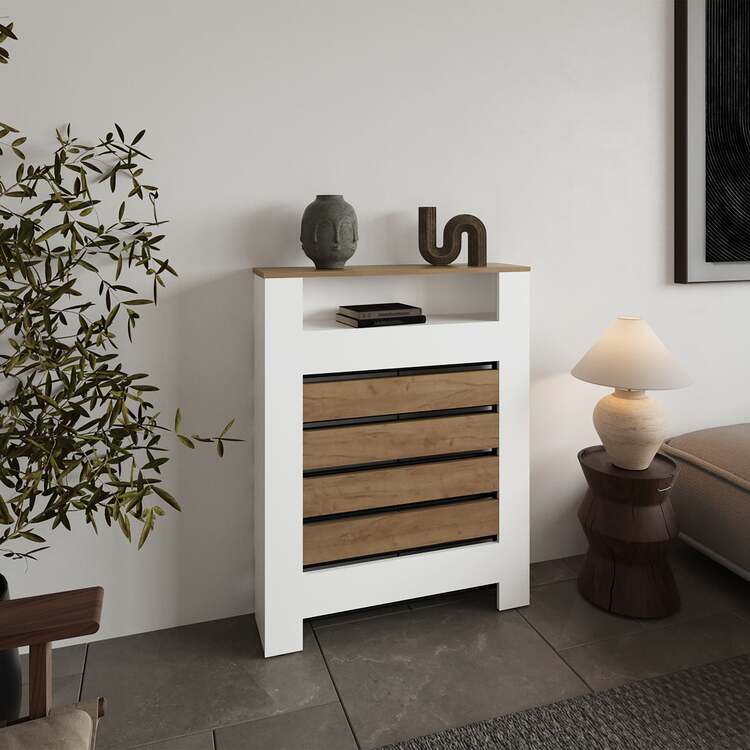 TUHOME Modern Radiator Cover Cabinet - Slatted Wood Shelf Unit