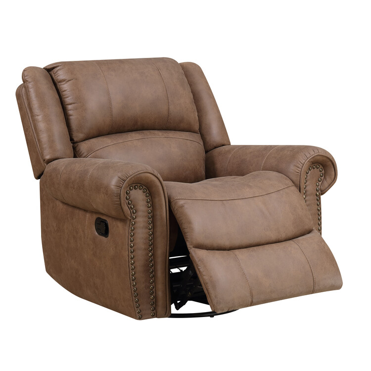 • Weathered Brown Swivel Reclining Glider with Nailhead Trim and Pillow Back image - 1