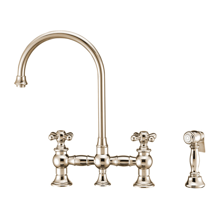 • Whitehaus Vintage III Plus Bridge Faucet with Long Gooseneck Swivel Spout, Cross Handles and Solid Brass Side Spray image - 1