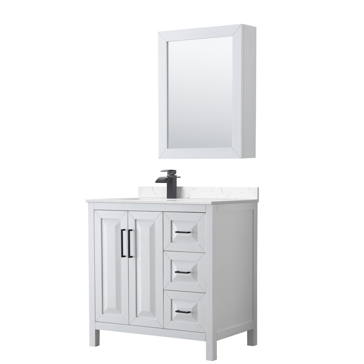 • Wyndham Collection Daria 36 Inch Single Bathroom Vanity in White, Carrara Cultured Marble Countertop, Undermount Square Sink, Matte Black Trim, Medicine Cabinet image - 1